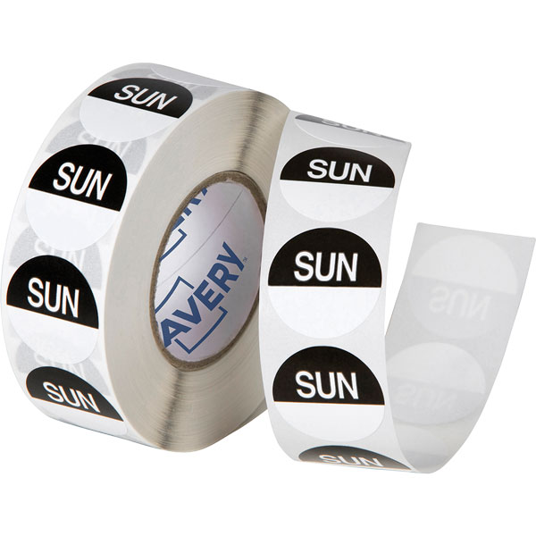AVERY 937411 REMOVABLE DAY LABEL SUNDAY ROUND 24MM BLACK WHITE ROLL 1000