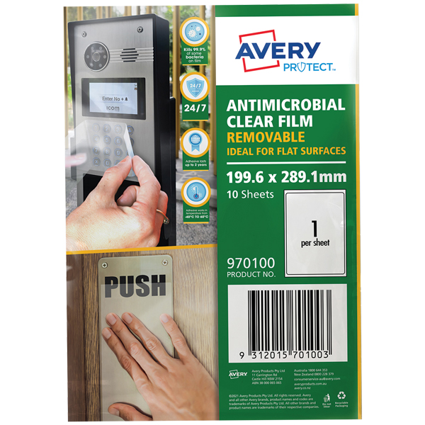 AVERY PROTECT ANTI MICROBIAL REMOVABLE FILM 1UP A4 PACK 10