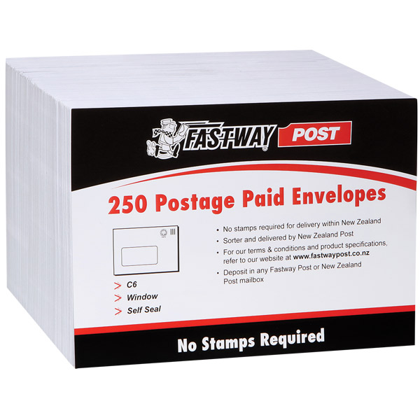 FASTWAY POST ENVELOPE POSTAGE INCLUDED WINDOW PLAIN SELF SEAL C6 W162 X L114MM WHITE PACK 250