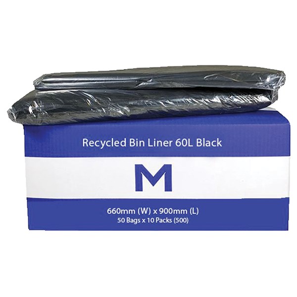 MPH RECYCLED BIN LINER 60L 650 X 900MM 30MU BLACK PACK 50