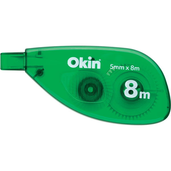 Okin Correction Tape fixes errors like they never happened. Using the easy-to-use dispenser the tape is smooth and requires no drying time so you can write on it instantly. Side dispensing mechanism allows you to clearly see what you are covering. 5mmx8m. White.