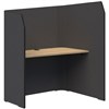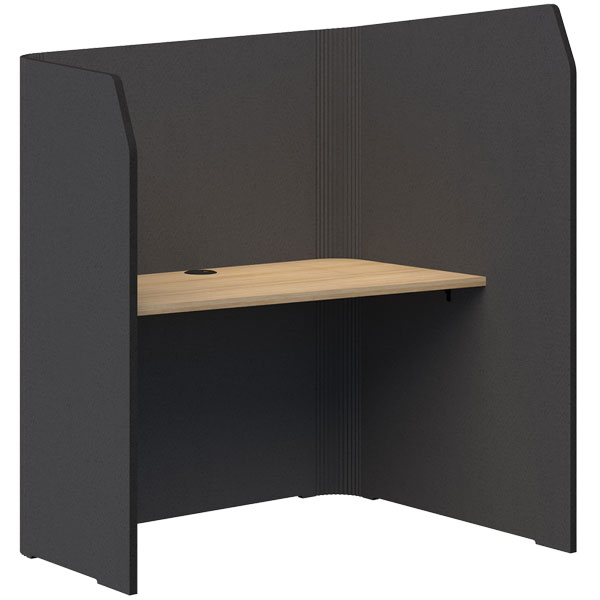 The high return wall shields users from distractions, while the angled desktop enhances privacy and acoustic performance