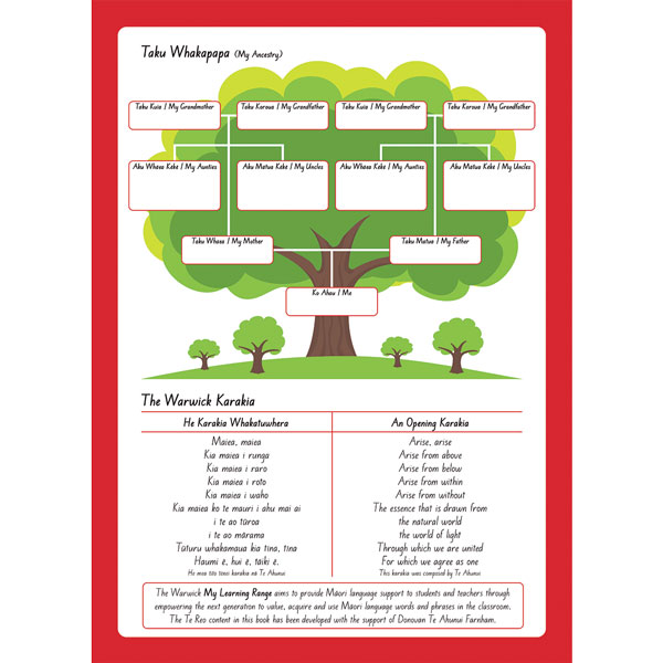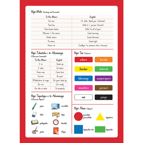 Reference material includes colours, greetings, items and an illustrated map of New Zealand in Te Reo
